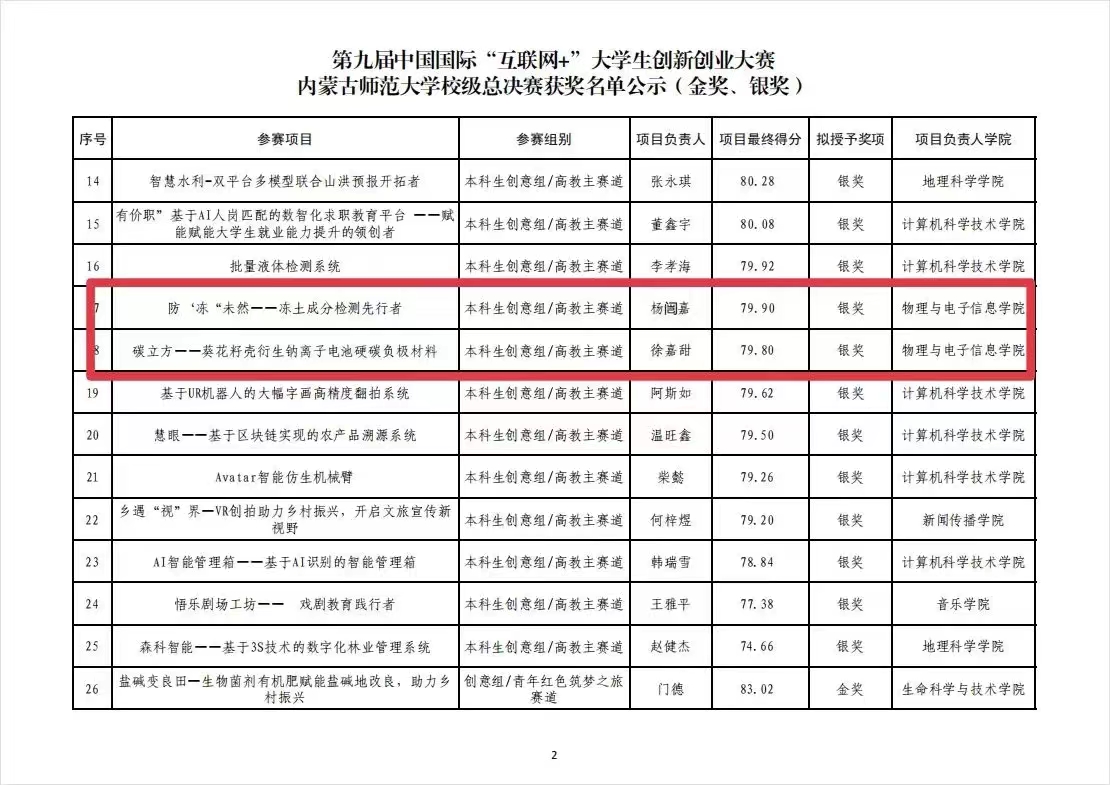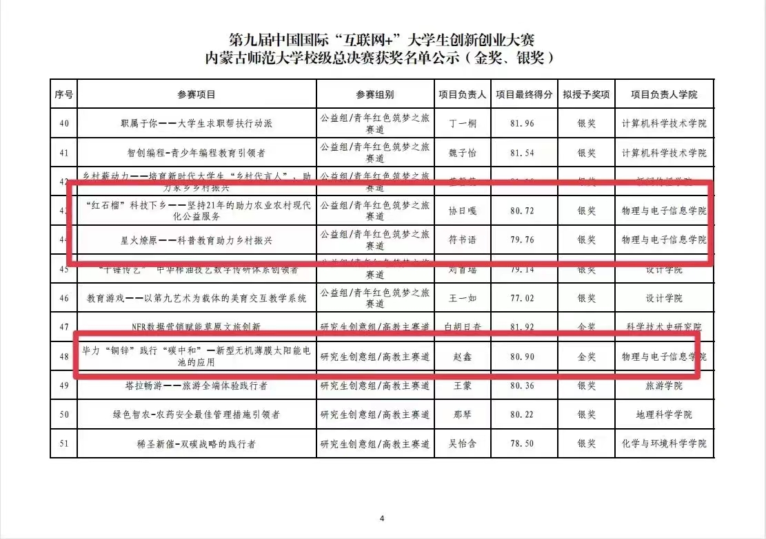 摘得了三金四银的好成绩,其中“草立方——牧草补光生长方案开拓者”、“碳求真理,碳缩未来”、“'毕力'铜锌践行'碳中和'——新型无机薄膜太阳能电池的应用”获得高教主赛道本科生、研究生创意组金奖,“防'冻'未然——冻土成分检测先行者”、“碳立方——葵花籽壳衍生钠离子电池硬碳负极材料”获得高教主赛道本科生创意组银奖,“'红石榴'科技下乡——坚持21年的助力农业农村现代化公益服务”、“星火燎原——科普教育助力乡村振兴”取得了青年红色筑梦之旅公益组银奖。
