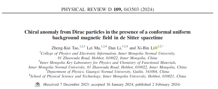 理论物理团队青年教师李喜彬博士的最新研究成果:“Chiral anomaly from Dirac particles in the presence of a conformal uniform background magnetic field in de Sitter spacetime” [PHYSICAL REVIEW D 109, 043503 (2024)]。该工作由陶正奎、马蕾、李丹共同完成,球吧网
