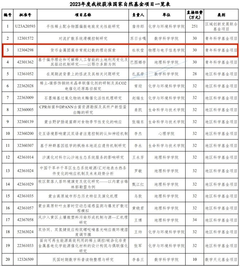 杜秋莹老师主持的《货币金属团簇非常规幻数的理论探索》获批青年科学基金项目。