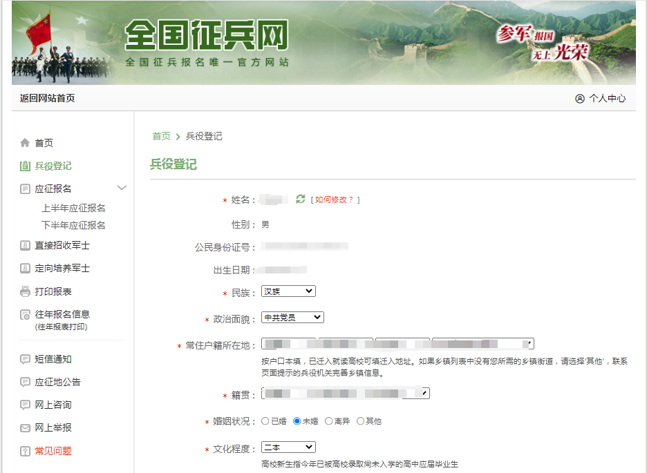 ①兵役登记和报名信息修改: