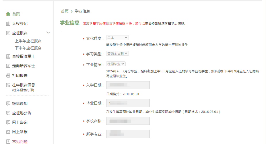 ●学业信息:填写学信网学生档案中的学籍学历信息,如果对学籍信息有疑问,请登录学信网查看确认如果学业信息审核不通过,请咨询学校或武装部修改。核验通过后将不能更改,核验时间为一个工作日。