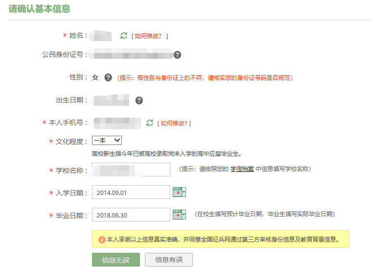 填写完以上信息,网上应征报名就完成了,请大家耐心等待系统对个人信息进行验核,验核通过之后武装部就会在规定的时间通知大家进行体检。友情提醒:填写完成之后点击信息无误后系统会花几秒钟审核你填的信息和学信网信息有无出入,大家要仔细查看有没有错误,错了可以点击重新确认个人信息可以修改。