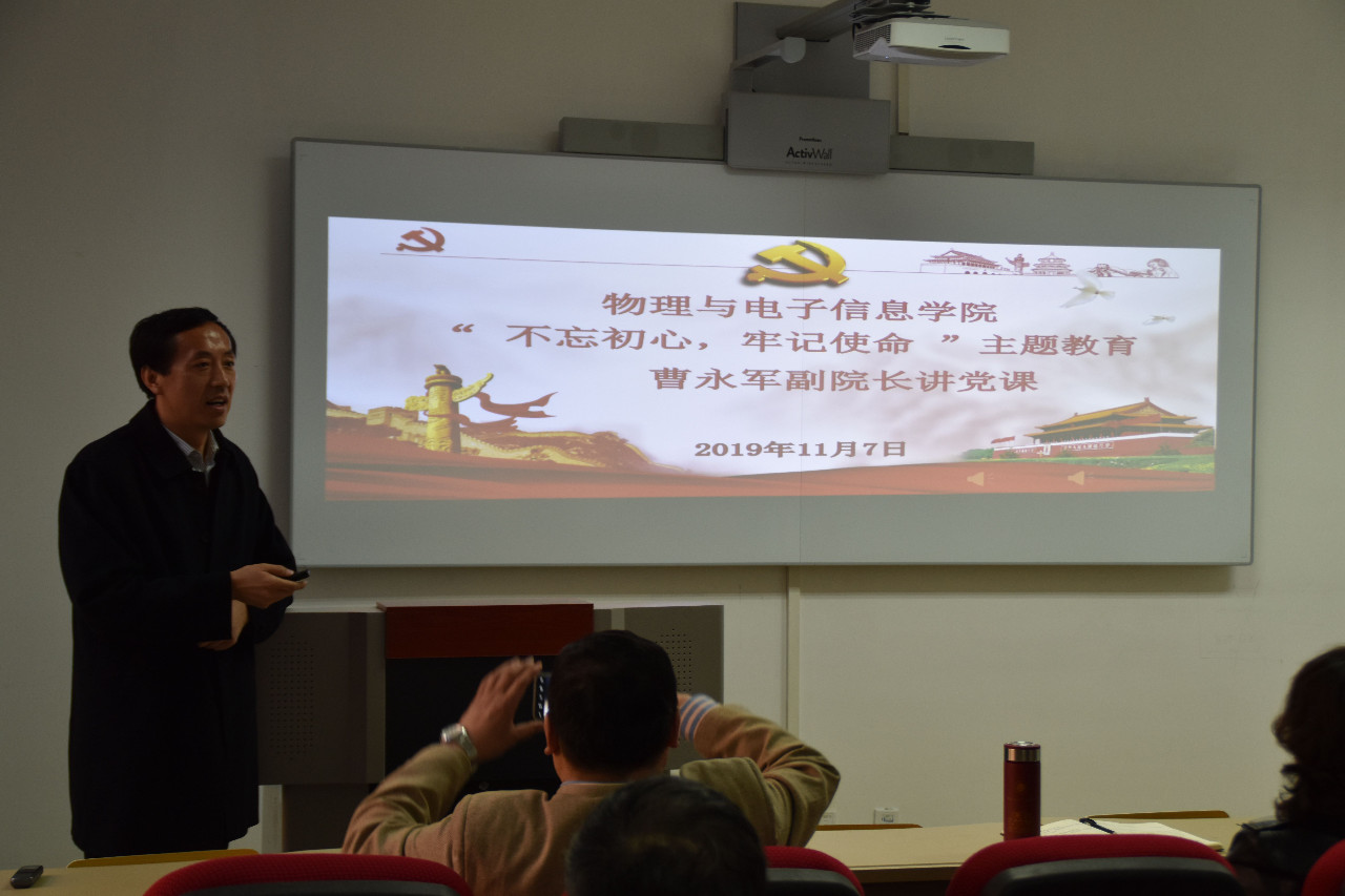 教职工的思想觉悟水平,11月7日下午,学院在理工楼B座202召开“院长讲党课”主题活动,曹永军副院长以“干事创业敢担当,努力推进学院高质量发展”为主题展开本次党课,学校主题教育指导组张克玉、董强到会指导,学院全体教职工参加此次活动。