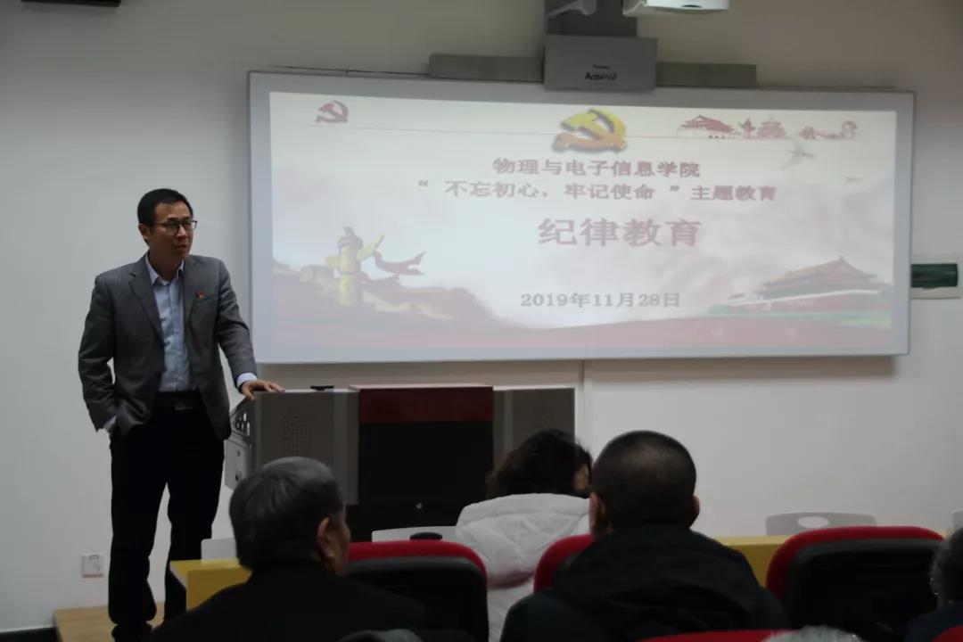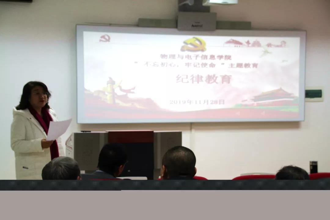 于理工楼A座303开展“不忘初心,牢记使命”主题教育之纪律教育专题讲座。讲座由刘美玲书记主持,特邀内蒙古师范大学纪委监察处林海河副处长主讲,全院教职工共计五十余人参加本次讲座。