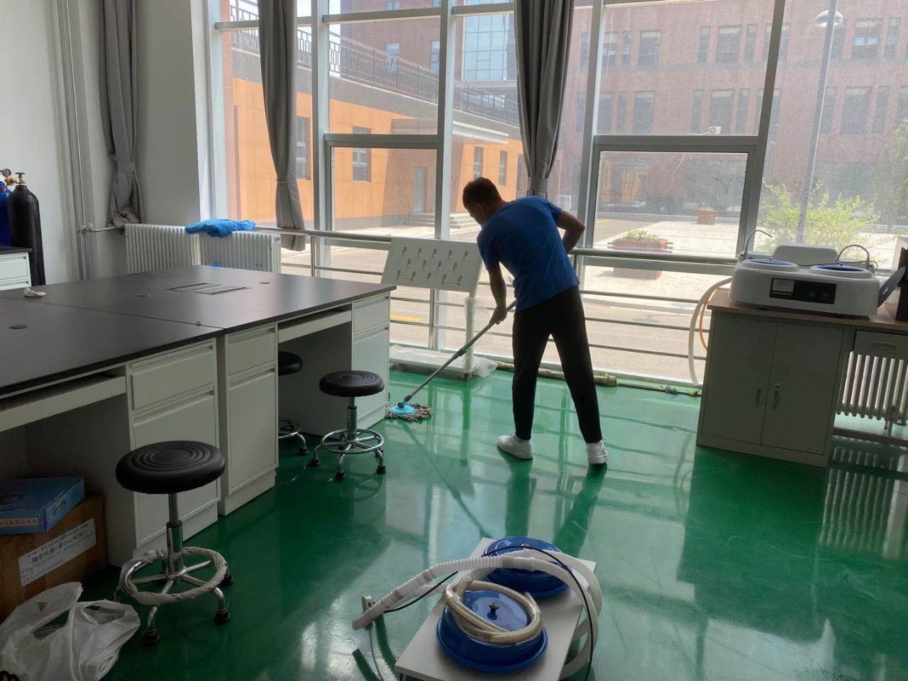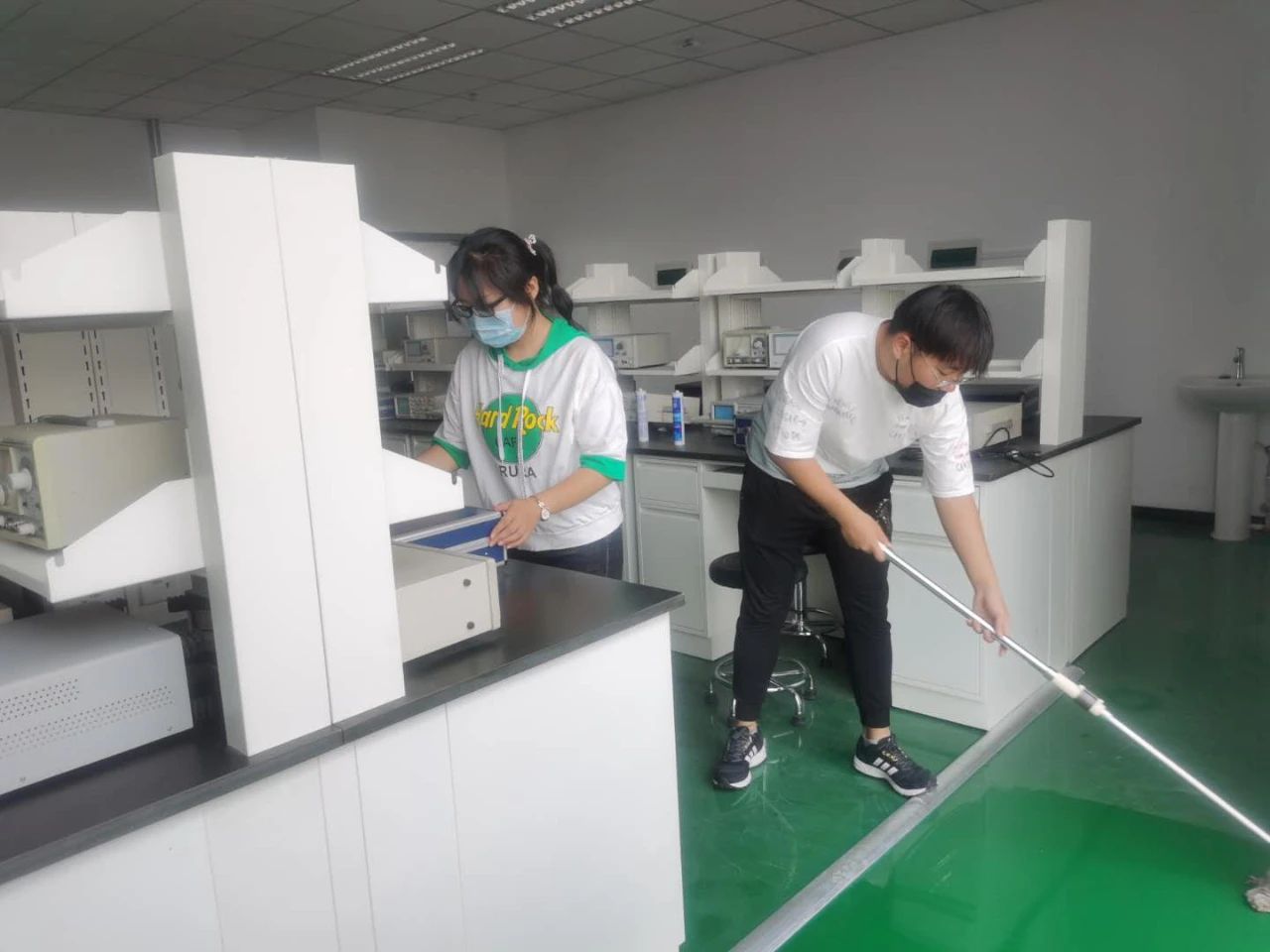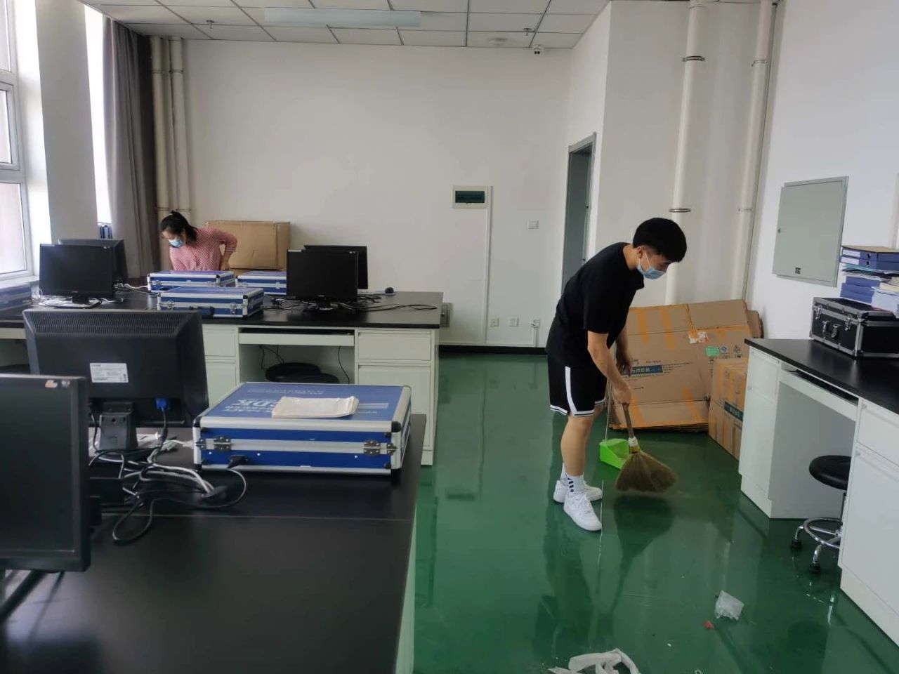 学生党员以班级为单位,分8个清理小组,对理工楼第一、五、六、七、八、十、十一和十二层实验室进行卫生清扫。活动中,大家纷纷拿起扫帚、拖布、抹布等工具,打扫尘土,清理桌面和地面污垢,经过2个小时的分工协作,各个实验室洁净如新。