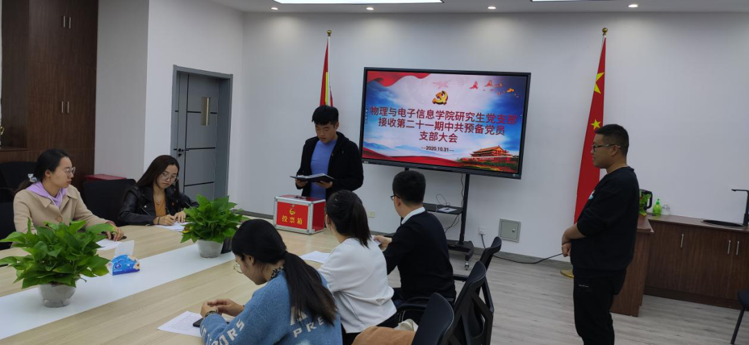研究生党支部于10月31日在理工楼A0701会议室召开关于接收第二十一期中共预备党员支部大会。研究生党支部书记木其尔,全体研究生党员及4名被发展对象参加本次会议。木其尔老师主持会议。大会围绕接收丁研、郑树玉、陈智慧、王娜4名发展对象成为预备党员,并通过大会讨论决定发展对象的入党事宜。