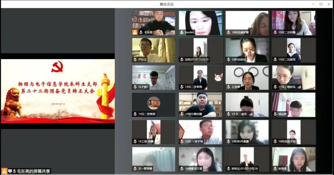 5月7日晚,本科生党支部云端召开全体党员大会,党支部书记宝力尔主持会议,本科生支部党员、预备党员全体参加。