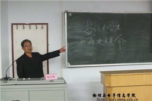 邀请到我校老干部宣讲团郝志模教授为大一新生进行“当代大学生历史使命,你能否承担”理想信念主题讲座。 在讲座中,郝教授对当代青年的不同时期的责任做出了详细的解说。他指出,当代青年承担全面建设小康社会和实现“两个一百年”其中的第一个“一百年”奋斗目标,它是我们当代青年的近期任务;坚定不移的走中国特色社会主义道路,实现中华民族的伟大复兴,完成第二个百年奋斗目标,维护世界和平,这是我们当代青年的长期任务。他最后勉励在座的大一新生们,青年是祖国的未来,民族的希望,青年兴则国家兴,作为当代青年,一定要有理想,有抱负,望同学们心中有国,敢于担当!随后,在座的同学们发出热烈掌声,讲座在热烈的鼓掌声中结束。