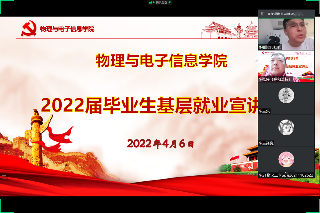 师生进行了分析和解读;2016级级物理学蒙班毕业生,现任职于新疆巴州和静县第六中学的特岗教师国庆,结合自身经历,以问答形式介绍了他在新疆基层的生活及基层就业的相关政策,深入浅出,通俗易懂;2014级电子信息科学与技术专业毕业生,现任职于江西省女子监狱民警黄玉云,以自己从微软公司实习生——“三支一扶”扶贫干部——女子监狱民警的丰富经历,真切的告诉我们基层是“一条你走的时候会哭,走过了回头看还是会哭的路”,前者是砺炼,后者是感激。