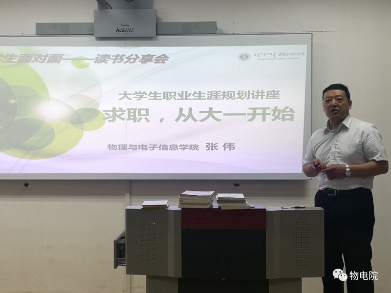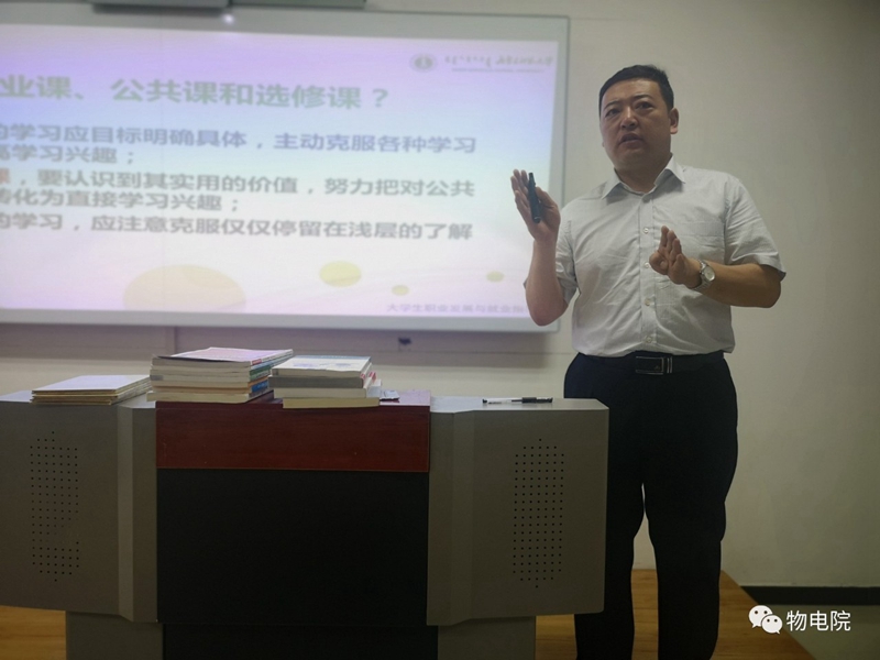 党总支副书记张伟以读书分享的形式,为18级电子信息科学与技术班和电子信息工程班的同学进行了题为《求职,从大一开始》专题讲座,班主任段国俊、辅导员宋鑫伟老师到场与学生共同聆听了讲座。