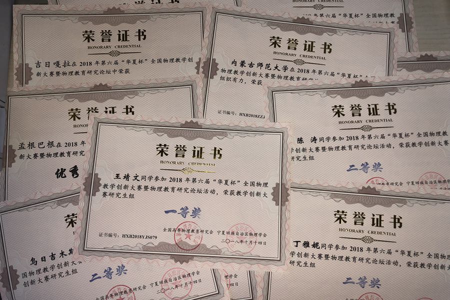 参加第六届“华夏杯”全国物理教学创新大赛获奖研究生球吧网 研究生教学技能大赛合影获奖证书王靖文同学荣获“华夏杯”一等奖丁雅妮同学荣获“华夏杯”二等奖陈涛同学荣获二等奖乌日吉木斯同学荣获“华夏杯”二等奖