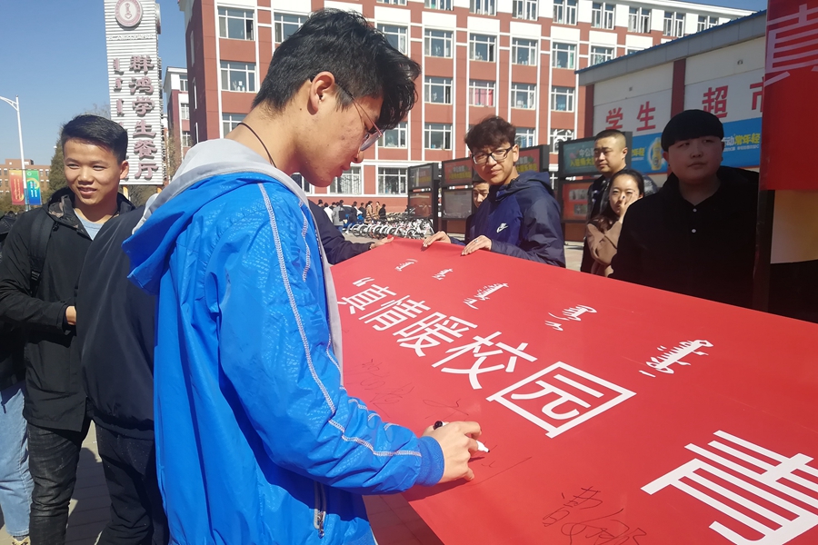 最后,各学院代表在标有“真情暖校园,青春见行动”的条幅上签字。