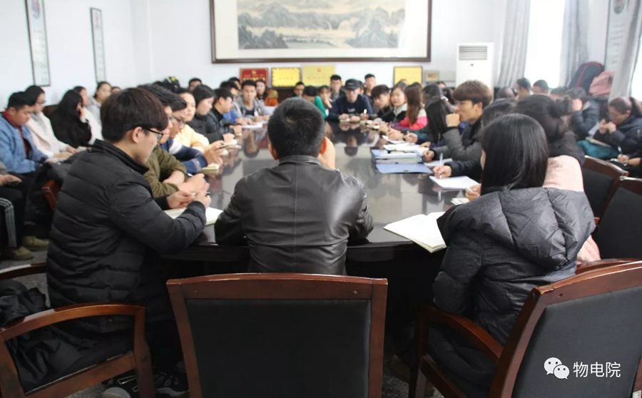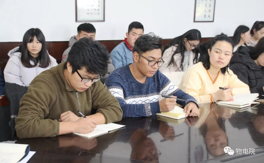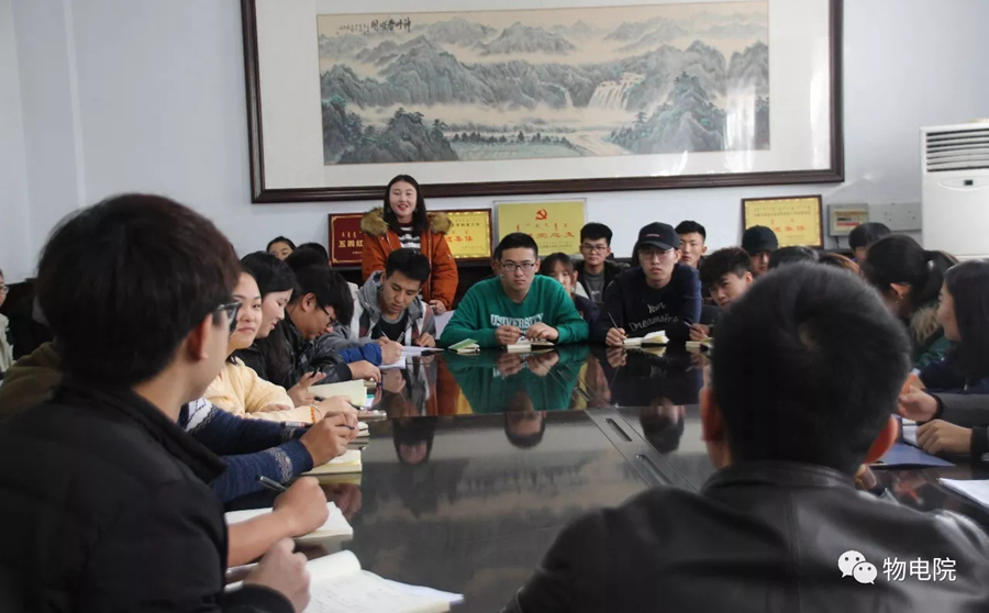 本网讯 2017年11月26日,球吧网 学生会在物理楼会议室举办党的“十九大”精神学习会。学院党总支副书记何小龙老师担任主讲人,学工办木其尔老师出席学习会。 学习会上,何老师以“学悟思践”为引子,提出了学习党的十九大精神的要求,希望学生干部能够通过学习“十九大”精神,并运用到自己的学习生活中去。学院上下要掀起一波学习十九大的热潮,就要从学生会干部开始,辐射到每个班级,每个学生,做到人人学,人人知,人人懂。 随后,何老师以党的十九大主题“不忘初心,牢记使命,高举中国特色社会主义伟大旗帜,决胜全面建成小康社会,夺取新时代中国特色社会主义伟大胜利,为实现中华民族伟大复兴的中国梦不懈奋斗”为学习内容,分四点为同学们高度概括了党的十九大下一步党和国家的发展方向与目标,并且逐项对同学进行讲解。讲到这里何老师特别指出,中国共产党人的初心和使命,就是为中国人民谋幸福,为中华民族谋复兴。希望同学们努力学习,争取早日入党,向党员同志看齐。与会同学们认真聆听,并不时低头记录。 在学习党的“十九大”精神的过程中,何老师联系到“中国梦”这个议题,询问在场同学是否有近期的小目标,同学也结合自身实际予以回答。根据同学们的回答,何小龙老师结合理论向大家讲述了制定目标并努力学习工作对实现人生价值的积极意义。同时,何老师表示,“理论联系实际”是我们学习的重要方法,通过学习理论知识,领悟思考,再运用到实际学习生活中去。何小龙老师深入浅出的讲解让同学们在对党的“十九大”精神有了更加深刻的认识,受益良多。 本次学习会的顺利开展加深了同学们对十九大精神的认识、体会和理解。我们高校青年学子作为新时代的生力军,要积极努力学习,把个人奋斗目标和人生价值同民族的进步发展结合起来,为实现中华民族伟大复兴的中国梦作出自己的贡献。