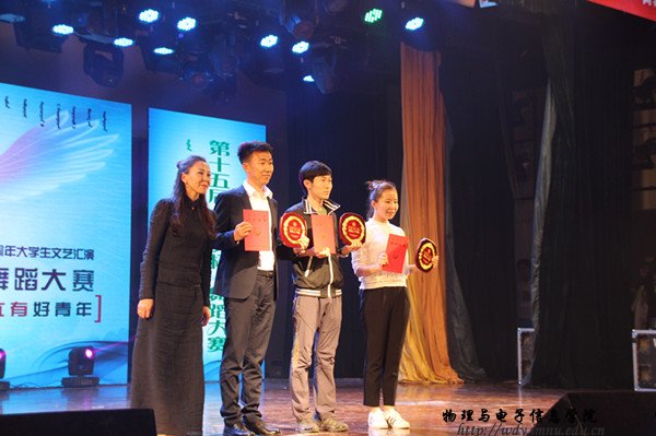 团总支书记萨其尔老师作为学院代表上台接过第十五届“百灵杯”舞蹈大赛二等奖奖牌与最具人气奖,并且萨老师与塔林托亚老师还获得优秀指导老师奖项。在晚会结束后,球吧网