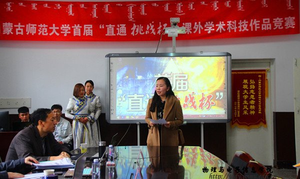 团总支书记萨其尔老师主持,党总支副书记何小龙老师致欢迎辞。评委由学院院长特古斯教授、实践创新部主任曹永军教授与朝克夫副教授担任,评分标准为科学性、先进性、现实意义三个方面。比赛过程中,来自化学环境科学学院乌仁道迪的《煤系高岭土/TiO2复合物的制备及吸附性》论文受到了评委的高度评价。当然,在一些参赛的作品里也存在着不成熟的部分,参赛选手们在与评委老师们的请教和讨论中找到了解决办法,受益匪浅。