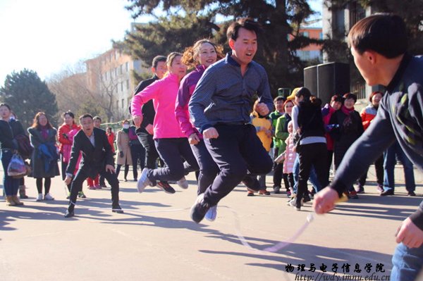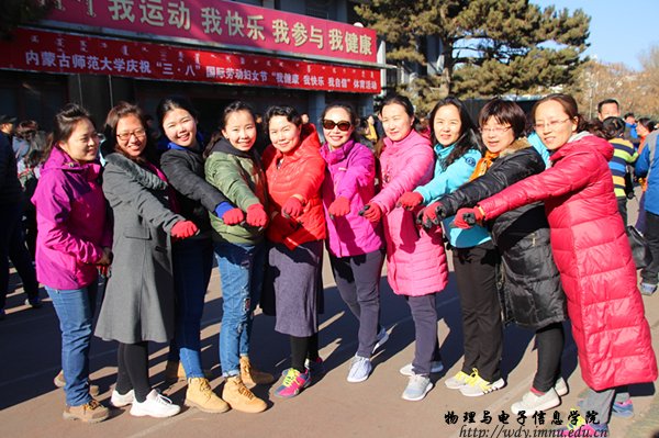 本网讯 “草树知春不久归, 百般红紫斗芳菲。”在这春回大地、草长莺飞的季节,又一个“三八国际劳动妇女节”翩然而至。为了纪念这一节日,让内蒙古师范大学女教职工享受到作为女性的幸福和快乐,感受到学校对女教职工的关怀和爱护,学校举行了“我健康,我快乐,我自信”体育活动来欢度这个特别的节日。对此,在2017年3月8日下午,女教职工老师参加了学校组织的“踢毽子,跳跳绳,拔河”三项赛。