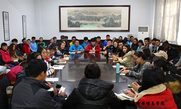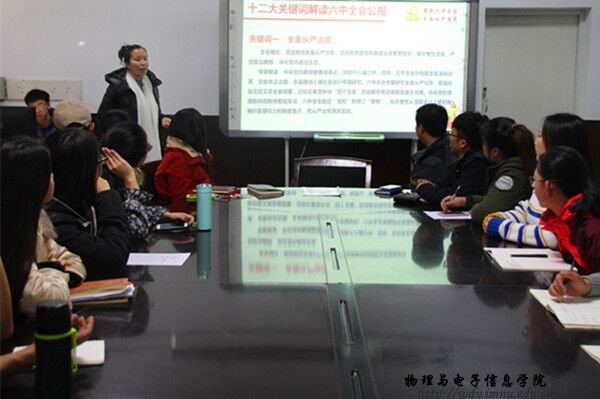于物电楼会议室召开了以“深入学习贯彻党的十八届六中全会精神”为主题的学习大会。团总支书记萨其尔老师,学工办苏雅拉、塔林托亚老师,以及学院学生骨干分子参加本次会议,并由萨其尔老师主持。