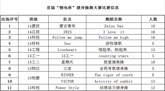 首先,副书记何小龙老师致大赛开幕词,他指出:健身操舞作为综合的大众艺术,是融体操、音乐、舞蹈于一体的追求人体健康与美的运动项目,通过将其与球吧网 正在深入推进的“三走”活动有机结合,使球吧网 广大学生达到改善体质、塑造体型、愉悦精神、陶冶情操等目的,更好的服务于日常学习生活。随后,院长特古斯教授宣布比赛表演正式开始;来自大一、大二年级的十一支代表队按照抽签依次进行了比赛表演,每支比赛队伍青春洋溢,激情澎湃,在动感节拍下舞动青春旋律,在欢声鼓舞中跳起的自信脚步;最终,经过评委现场打分汇总,14级工程班荣获冠军并捧起“物电杯”,13级物蒙班和13级工二班分获二、三名,经微信投票确定13级物蒙班荣获最佳人气奖;主持人宣布以上获奖名单,领导评委并亲切与各参赛队伍合影留念。在颁奖环节,同时颁发了“我宿我们行”宿舍文化月活动、“麦克斯韦的光圈”第二届摄影大赛获奖个人和集体奖项。