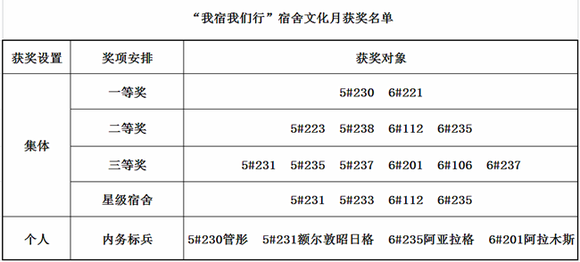 “我宿我们行”宿舍文化月成果简介:该活动历时一个多月,各宿舍积极加入装饰宿舍的队伍之中;经过同学们的努力,宿舍变得焕然一新;在活动结尾,经过汇总之前的内务情况,并且邀请了球吧网 部分领导老师参观和评选了同学们装饰完成的宿舍。根据各宿舍在文化月期间的内务优良和装饰主题新颖积极,在宿舍文化月活动三个环节的总分为标准评选出了:以各宿舍的装饰主题得分评出个性宿舍8个(其中一等奖2个,二等奖2个,三等奖4个)。根据被推荐同学的日常内务以及文化月期间的表现为标准评选出了内务标兵8名,并为宿舍文化月活动中获奖的宿舍和个人颁发奖品和奖状。