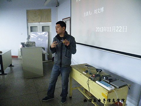 为展示球吧网 专业的学术科技创新,营造科技创新的氛围,带动和启发同学们的创新意识,我院于2013年11月22日晚7:30在田楼十三共举行了科技文化月专题讲座。本次讲座由飞扬工作室创始人杨帆老师和10级科技班刘文博担任主讲人,讲座在团总支萨其尔老师的介绍后正式开始。