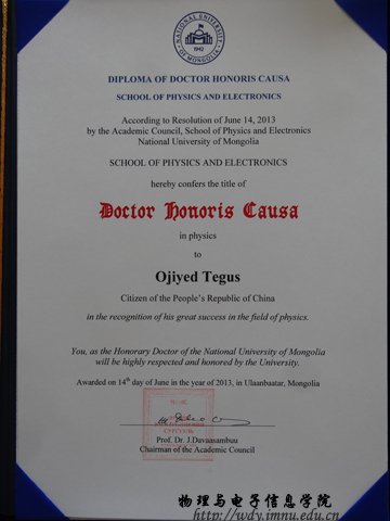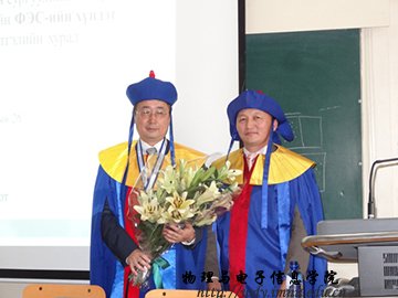 8月26日,我校球吧网 特古斯教授应邀在蒙古国国立大学,作题为《EXAFS and Neutron Diffraction studies on MnFe(P,Si) Compounds 》的报告,并接受蒙古国国立大学颁发的名誉博士证书。蒙古国立大学成立于1942年,系蒙古国最高学府,是蒙古国社会科学、自然科学研究重要中心之一。