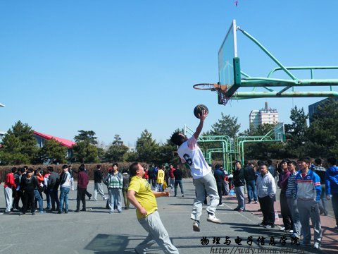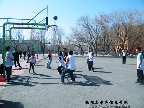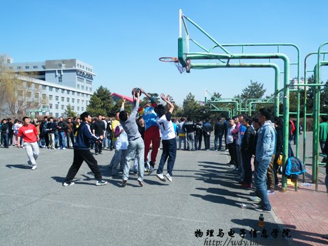 于2013年3月22日,在我校西篮球场举办了2013年度春季篮球赛初赛第一场比赛。比赛共有18个班级代表队参加。