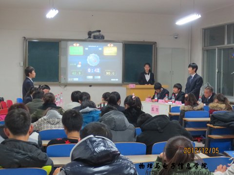 参加此次比赛的正方12级物理汉班与反方12级科技班,随着比赛的开始,各班都围绕着本组的辩题“成功的关键在于奋斗还是在于机遇”进行着激烈的论战。辩手们都拿出了良好的素质与心态,认真阐述自己的观点。自由辩论阶段则是将比赛推向了高潮,同学们旁征博引都表现出不甘示弱的态度。而且在算分员统计比赛分数时各班也都献上了精心准备的节目。