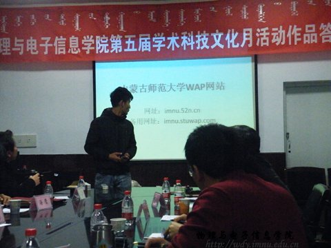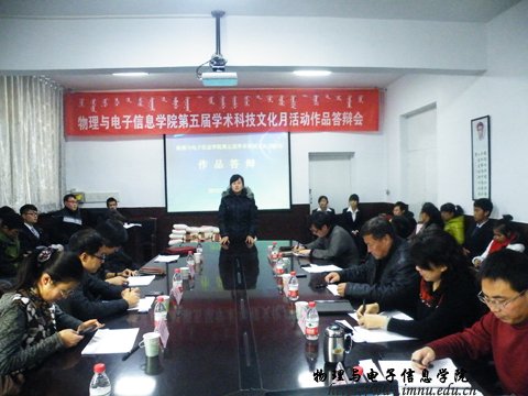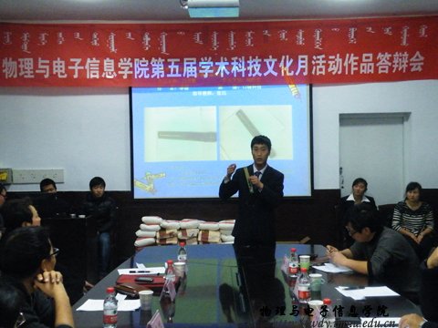 继承往年优良传统,于2012年12月8日下午两点在物理楼会议室成功举办了“第五届学术科技文化月活动”作品答辩会。本次答辩会出席的老师有:副院长吉日嘎拉老师,副院长刘美玲老师,党总支副书记何小龙老师,梁学军老师,海鹰老师,张丽娜老师,朝克夫老师,孟巴根老师,杨帆老师,侯爱玲老师,呼和老师。