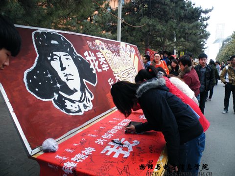 在师大餐厅门口举办志愿者学雷锋签字活动,短短一中午时间,横幅上签下了满满的名字。