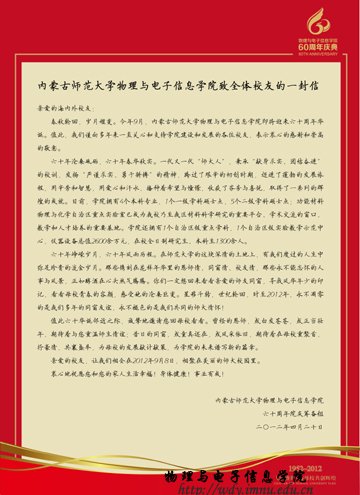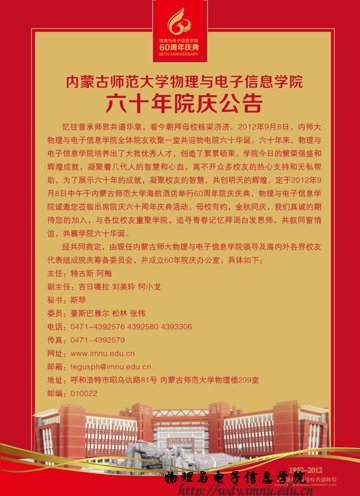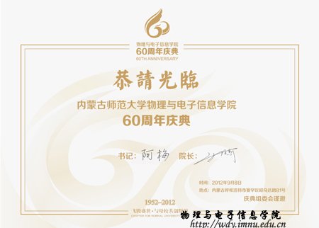 定于2012年9月8日中午于内蒙古师范大学海航酒店举行60周年院庆庆典,学院全体师生诚邀您莅临出席院庆六十周年庆典。母校有约,金秋同庆,我们真诚的期待您的加入,与各位校友重聚学院,追寻青春记忆拜谒白发恩师,共叙同窗情谊,共襄学院六十华诞。