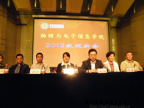 党总支书记阿梅老师、院长特古斯教授、党总支副书记何小龙老师、副院长吉日嘎拉老师、副院长刘美玲老师、办公室主任斯琴高娃老师、物理系主任张敏老师、电子系主任梁学军老师、实验中心副主任张天臣老师、团总支萨其尔老师、学工办呼和老师以及大一各班班主任。见面会由团总支萨其尔老师主持。