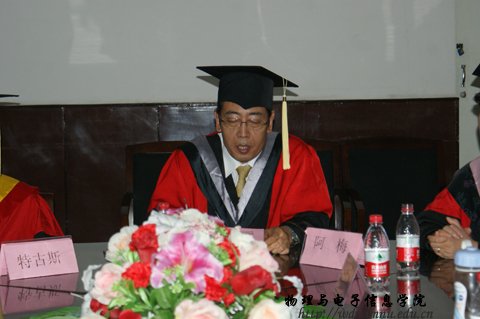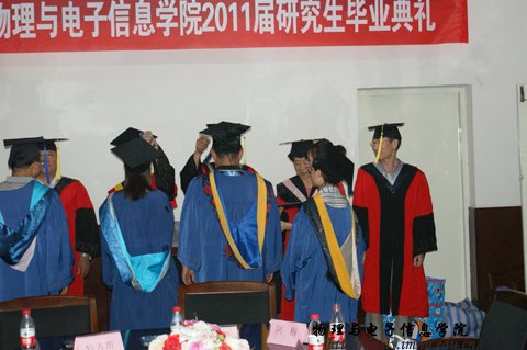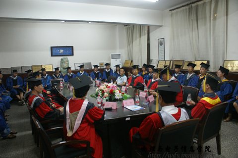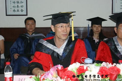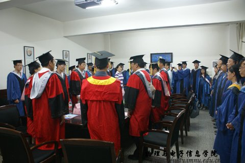 在物理楼会议室隆重举行了2011届硕士研究生毕业典礼暨学位证书颁发仪式,参加毕业典礼的有,院长张伟教授,党总支书记阿梅老师,党总支副书记何小龙,副院长吉日嘎拉、副院长刘美玲和学院全体研究生导师及2011届全体硕士毕业研究生。