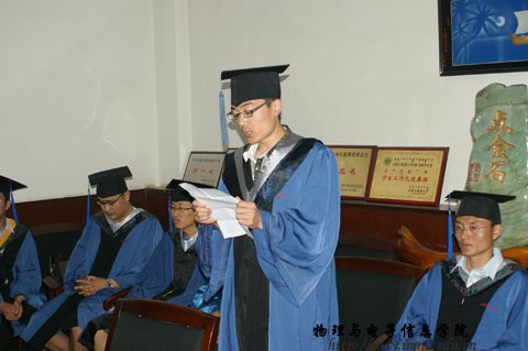 全体硕士毕业生发言。他说,研究生们能够有丰硕的研究成果,是得益于良师的指导和丰富的学习资源。无论是继续深造还是步入社会,他们都会牢记母校的校训,用知识回报社会,用成就回馈母校和学院,以报答他们的恩师。