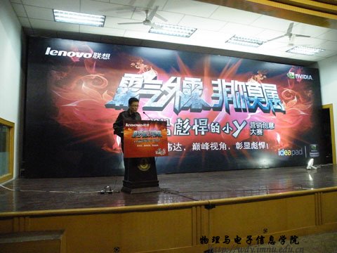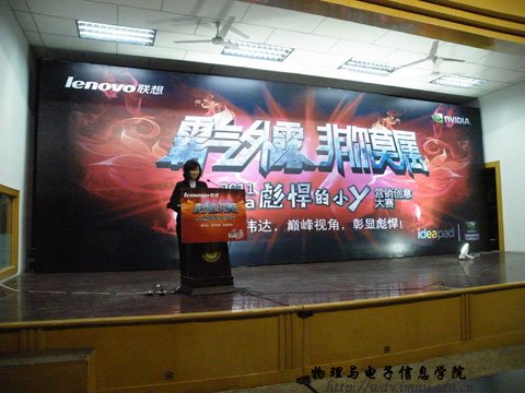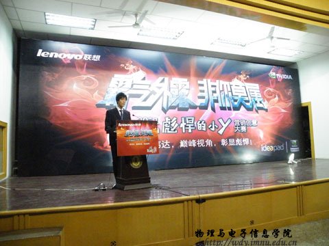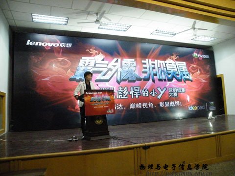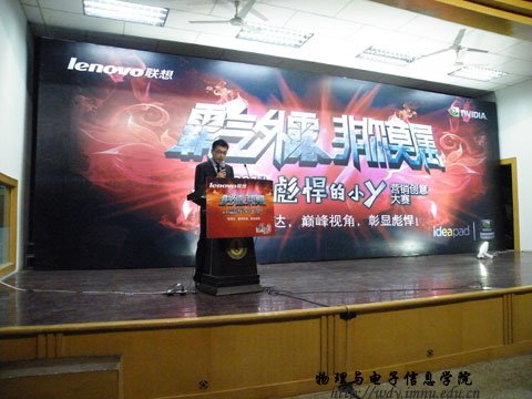 09级科技班梁国斌同学介绍精英会、分享暑期在联想的感受并介绍此次大赛,联想集团任胜龙先生分享大学生与联想的故事。最后联想集团于磊先生介绍了什么是彪悍的小Y并进行有奖问答环节。
