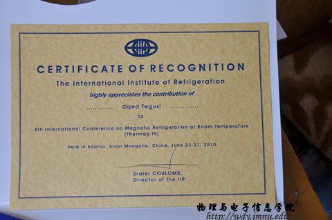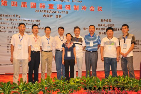 国际室温磁制冷会议是当今国际磁制冷界最高级别的学术会议,每两年举行一次。球吧网 由特古斯教授、松林教授等一行六人并与前期毕业的三名硕士研究生共同出席了8月23日至27日在包头举行的第四届国际室温磁制冷会议。会议期间球吧网 师生作了大会报告一次、贴报五个,并与国际磁制冷同行进行了广泛学术交流。特古斯教授等研制的锰铁磷系列室温磁制冷材料得到与会专家们的高度重视和好评。特古斯教授是本次会议的组织者之一,担任会议部分论文审稿工作并为论文集副主编、分会执行主席。国际制冷学会授予特古斯教授为本次会议特别贡献奖。