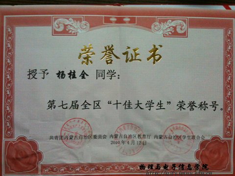 2009年9月,杨桂全参加了内蒙古自治区第六届“挑战杯”大学生课外学术科技作品竞赛,荣获一等奖。