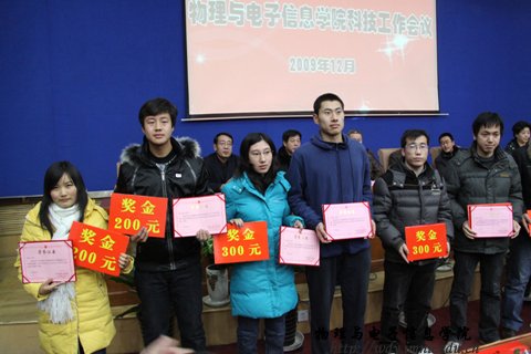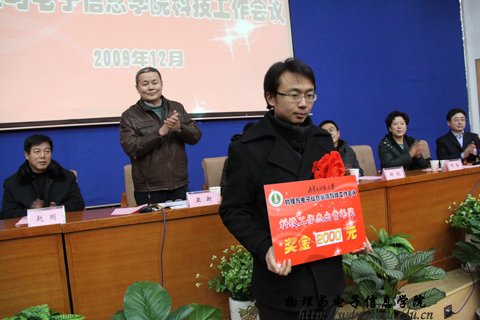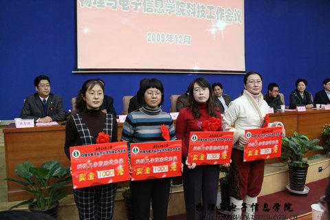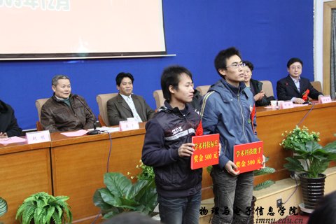 第二届学生课外学术科技作品竞赛中荣获一等奖的何玮等3名同学,发奖金300元;荣获二等奖的包文君等7名同学,发奖金200元;荣获三等奖的王瑞民等10名同学,发奖金100元;授予梁学军等6人为优秀指导教师,授予07工程2班、09科技班优秀组织奖。与会领导为获奖师生颁发了奖金和荣誉证书,获奖教师代表郭子政教授在大会上作了发言。