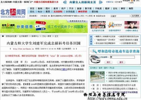 2006级凝聚态专业硕士研究生刘建军,赴北极参加科考任务进行了报道。记者3日了解到,刘建军已经圆满完成科考任务回国,并于6月2日晚在内蒙古师范大学信息楼做了一场题为《北极科考心得体会与极光简介》的讲座。