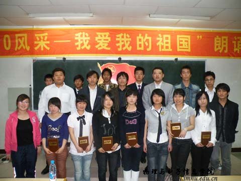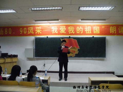 历时一个月的纪念五.四运动九十周年、新中国成立六十周年“扬80、90风采 —— 我爱我的祖国”主题朗诵比赛圆满结束。十一支团队共计十三位选手信心十足的走到了观众们的面前,他们用深情的声音地抒发了对“五.四”运动深深的感动,用激昂的话语再现了新中国成立60周年来特别是改革开放30年来社会主义建设事业取得的伟大成就。