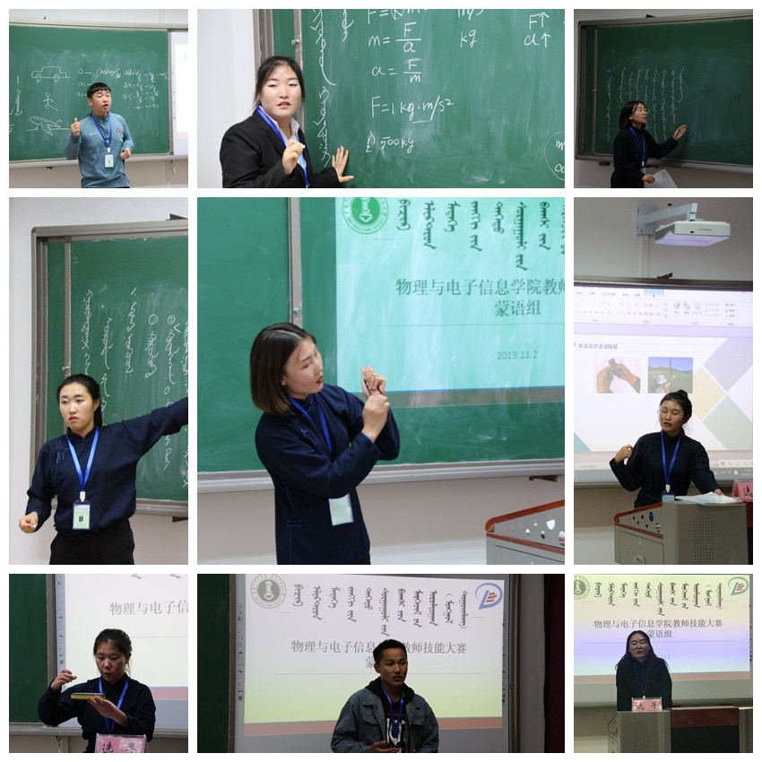于11月2日举办蒙语授课师范生教学技能大赛。比赛特邀呼市蒙校高级教师呼格吉勒图老师、教师发展与教育评估中心孟根巴根副教授、副院长那日苏教授、物理系副主任朝克夫副教授、乌仁图雅副教授作为本次比赛评委,萨其尔老师组织了16、17级物理蒙班学生参加本次比赛。