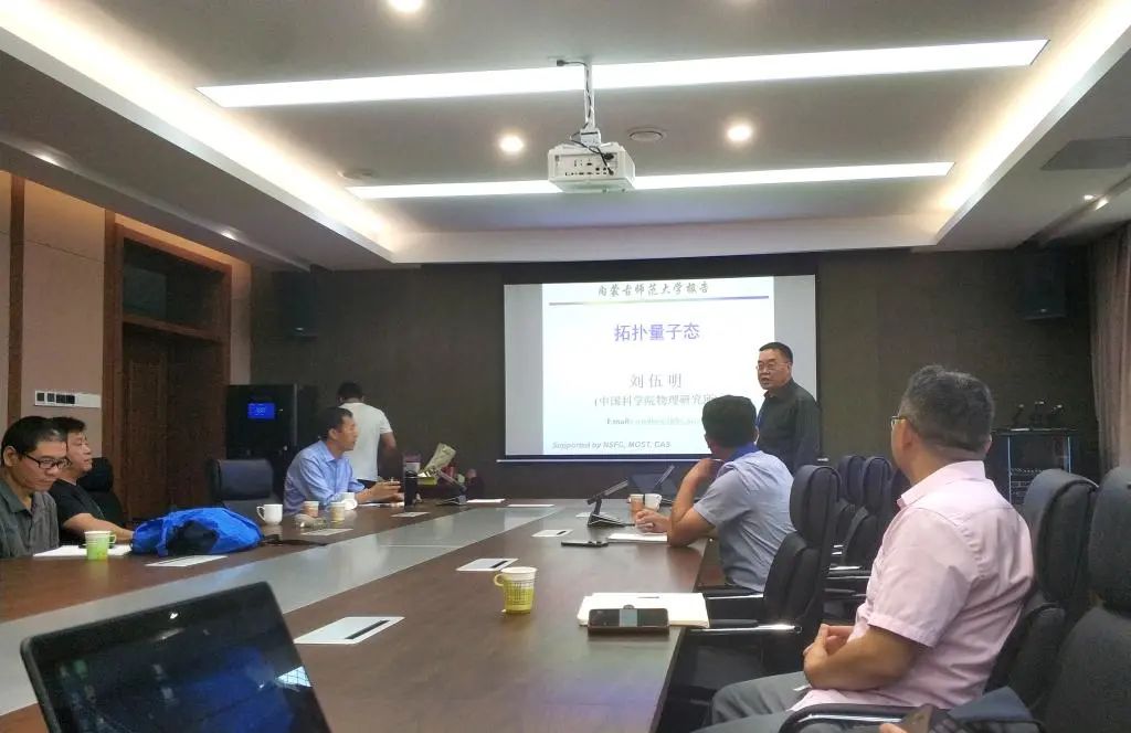 和自治区功能材料物理与化学重点实验室邀请,中国科学院物理所研究员、博士生导师、国家杰出青年基金获得者、国家973计划首席科学家、国家重点研发计划项目首席科学家刘伍明研究员在内蒙古师范大学赛罕校区文史楼二号会议厅为全院师生做了题为《拓扑量子态》的报告。学院副院长曹永军、副院长那日苏以及全院教师聆听报告,报告由副院长曹永军教授主持。为适应常态防疫形势要求,本次报告采用“线上”“线下”相结合的方式进行。