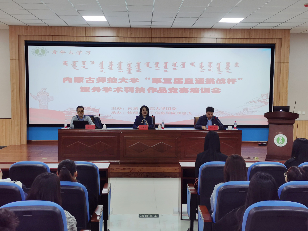 团总支承办的内蒙古师范大学第三届“直通挑战杯”课外学术科技作品竞赛培训会在盛乐校区学生事务中心一楼举行。会议分别由校团委副书记包双成、校团委挂职副书记那日苏主持,北京林业大学校团委副书记、副研究员张骅、内蒙古民族文化产业研究院院长董杰、物电院杨帆副教授分别围绕“挑战杯”自然科学类学术论文、哲学社会科学类社会调查报告和学术论文、科技发明制作的竞赛作品提升做了主题培训,球吧网