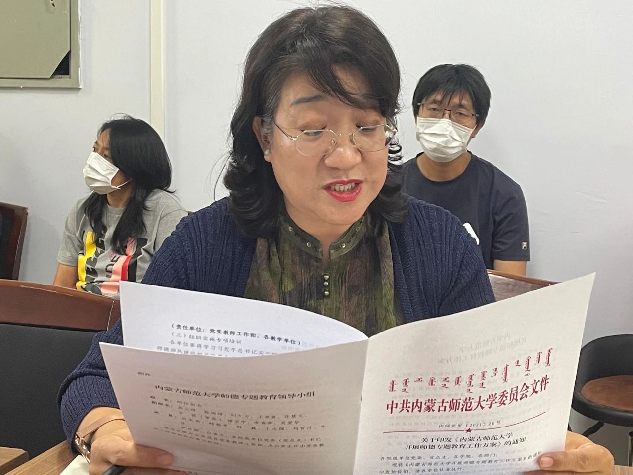 党委书记刘美玲领学师德师风建设学习。刘书记从目标任务、总体要求、教育内容、工作安排及工作要求等方面传达《内蒙古师范大学开展师德专题教育工作方案》,之后对《内蒙古师范大学教师师德师风建设学习手册(第一版)》、《师德警示教育(一)——违反高校教师职业行为十项准则典型案例》进行领读学习。