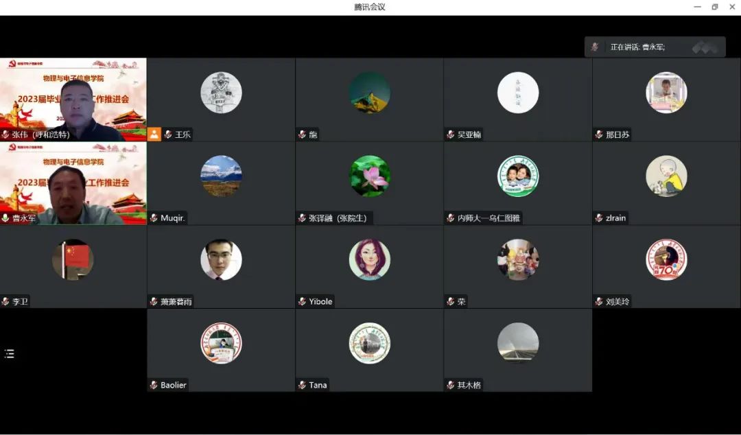 会议共五项内容。一是张伟副书记传达自治区教育厅《关于做好2023届全区普通高校毕业生就业创业工作的通知》,部署2023届就业工作;二是学就办副主任王乐汇报2022届毕业生就业情况;三是2022届毕业班班主任代表2018级物理学汉班其木格、2018级物理学蒙班伊博乐、2018级材料物理班李卫、辅导员王乐、宝力尔分享就业工作指导经验;四是2023届毕业班班主任2019级物理学汉1班张院生、2019级物理学汉2班李喜彬、2019级物理学蒙2班王乐、2019级物理学蒙1班乌仁图雅、2019级电子信息工程1班包秀荣、2019级电子信息工程2班张林睿、2019级材料物理班塔娜、2020级学硕班苏少龙、2021级专硕班木其尔老师依次介绍本班级拟升学、就业情况;五是辅导员吴亚楠解读2023届毕业生情况、辅导员包联就业工作,发放精准就业指导手册。