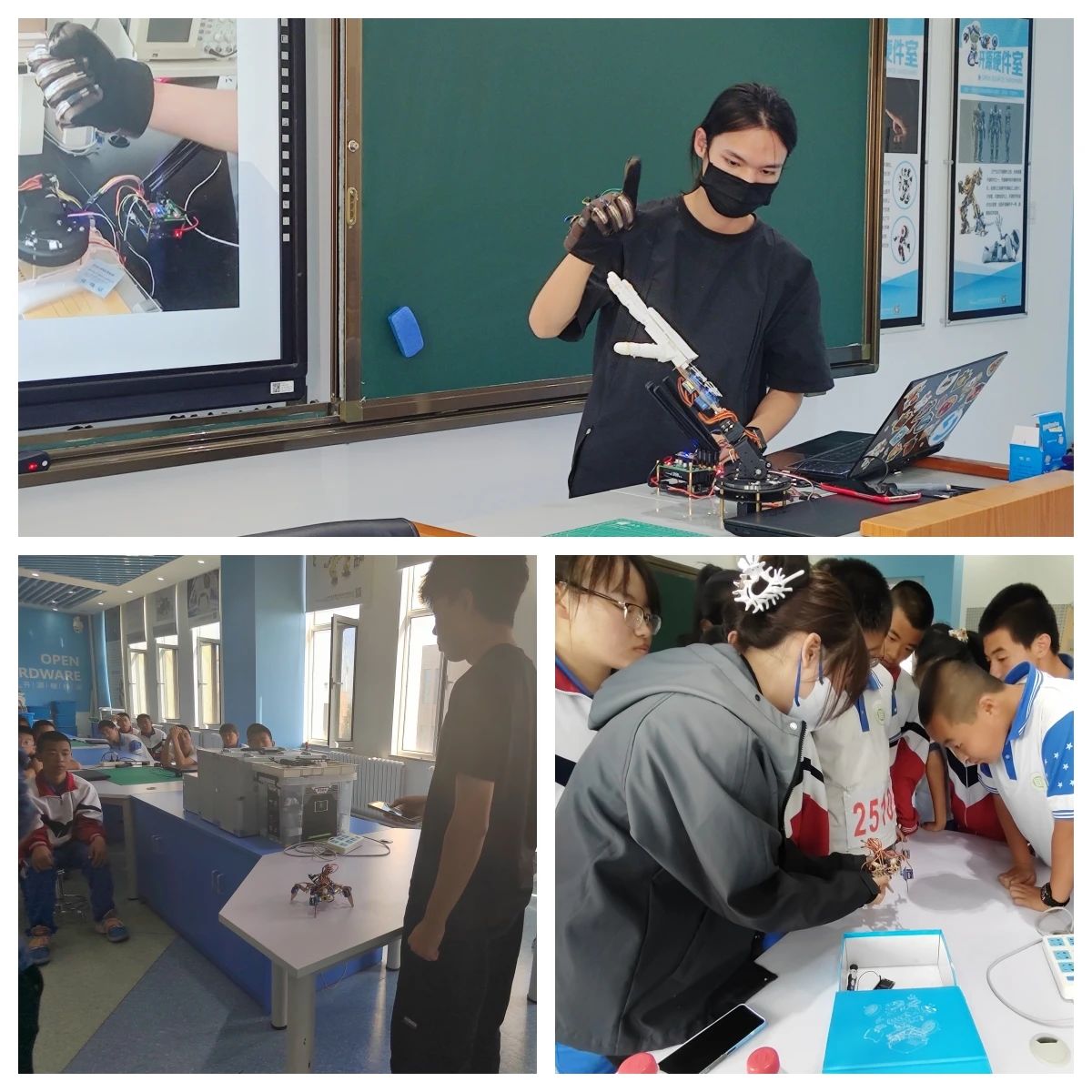 学生自行制作仿生机器人。同学们纷纷被这些独特而神奇的机器人所吸引,并积极参与互动。