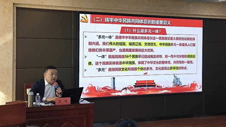 张伟书记围绕“统一思想认识,夯实铸牢中华民族共同体意识的思想基础;追寻总书记足迹,汇聚铸牢中华民族共同体磅礴伟力;加强师德师风建设,提升教师职业素养”三方面进行了深度讲解,使学员们更加坚定了树立“躬耕教坛、强国有我”的志向和抱负。