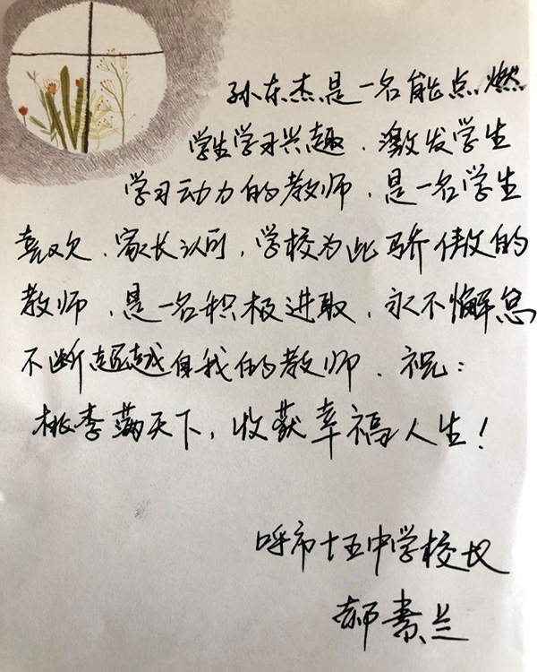 好家风,好教风,成就好学生。2016年6月孙东杰家庭被授予呼和浩特市“五好文明家庭”称号,2017年3月又被授予“第一届呼和浩特市文明家庭”称号。“家庭和睦则社会安定,家庭幸福则社会祥和,家庭文明则社会文明”。她“注重家庭、注重家教、注重家风”,她希望自己的孩子成为什么样的人,就用心、用爱把自己的学生培养成那样的人。从一个普通教师走到今天,在孙东杰身上,良好的家风、学风、教风很好地传承融合在了一起。优秀的家庭文化可以锻造一个人的品性,而这样的品性定能让她在教师教育工作岗位上走得更高更远。当收到学院让她回忆撰写“校友故事”的那一刻,她非常开心,也感慨万千。因为她这一点点的进步离不开母校的培养, 离不开老师们的悉心教导,离不开学校领导、同行们的指导和帮助,离不开她听过的所有授课老师在课堂上给她带来的思想上的冲击;当然,也离不开她那些可爱的学生们。感谢成长路上有这些可爱的人相伴!