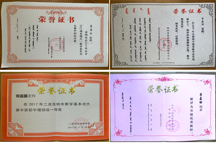 2014年至今,参加工作7年,她先后担任物理教师、班主任、初中部教务处主任、校课程研究中心副主任等职。在二连浩特市领导和第一中学校领导的培养下成长得很快,得到学生和家长的广泛认可。先后被二连浩特市委市政府评为“市级优秀教师”,被二连浩特市教科局评为“中考优秀教师”,获二连浩特市教学基本功大赛一等奖,在锡林郭勒盟初中课堂教学改革现场会承担物理学科观摩展示课……