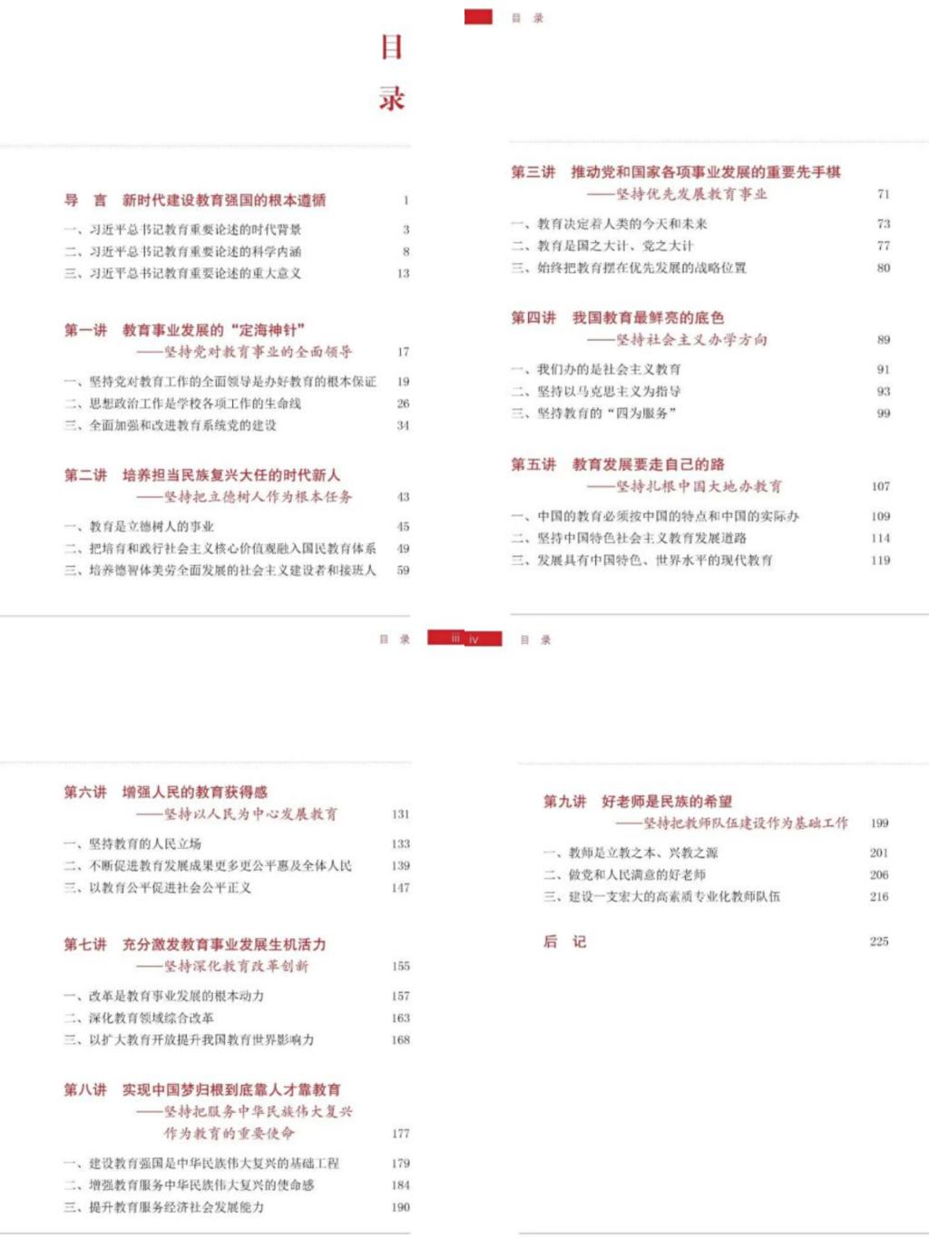 全书由导言和九讲构成,包括坚持党对教育事业的全面领导、坚持把立德树人作为根本任务、坚持优先发展教育事业、坚持社会主义办学方向、坚持扎根中国大地办教育、坚持以人民为中心发展教育、坚持深化教育改革创新、坚持把服务中华民族伟大复兴作为教育的重要使命、坚持把教师队伍建设作为基础工作等内容。