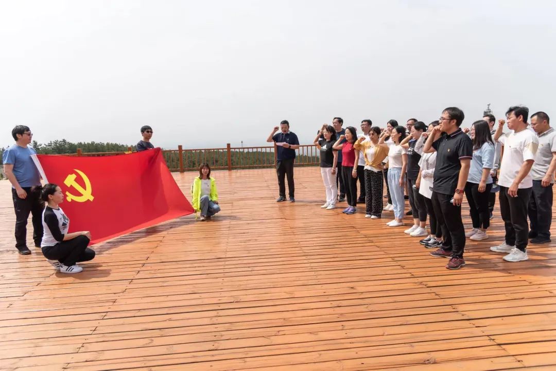 在大青山步道平台上,面对鲜红的中国共产党党旗,大家举起右拳,在张伟副书记的领誓下重温入党誓词,铿锵有力的誓言响彻山谷。
